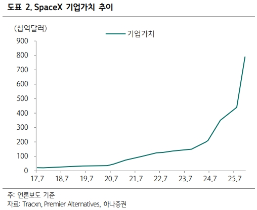 그는 이어 "미래에셋증권의 출자 금액은 2000억원으로 해외법인 투자분까지 포함하면 스페이스X 투자금액의 절반 이상을 차지한다"며 "미래에셋벤처투자의 투자금액은 40억원으로 미미한 수준인만큼, 스페이스X 기업가치 상승에 따른 평가이익은 미래에셋증권 실적에 유의미하게 반영될 것"이라고 내다봤다.