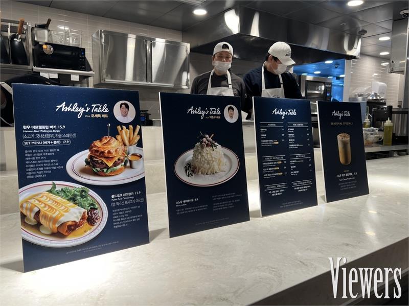 지난 19일 서울 성수동에서 운영을 시작한 애슐리퀸즈 팝업스토어 ‘하우스 오브 애슐리’ 현장에서 셰프 협업 메뉴 ‘애슐리 테이블(Ashley’s Table)’이 공개되고 있다. (사진=내미림 기자)
