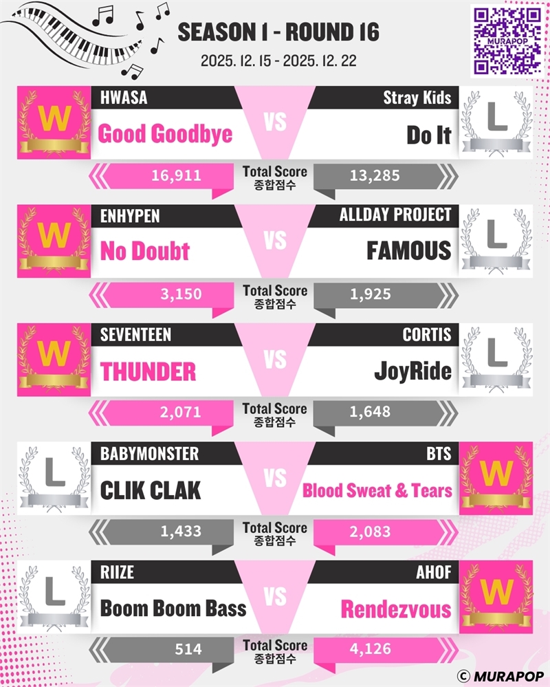 최근 뮤라팝은 12월 15일부터 12월 22일까지 진행된 뮤직비디오 라이벌매치 시즌 1-16회차 결과를 공개했다. 방탄소년단은 베이비몬스터(BABYMONSTER)와 맞대결 끝에 최종 승리했다.