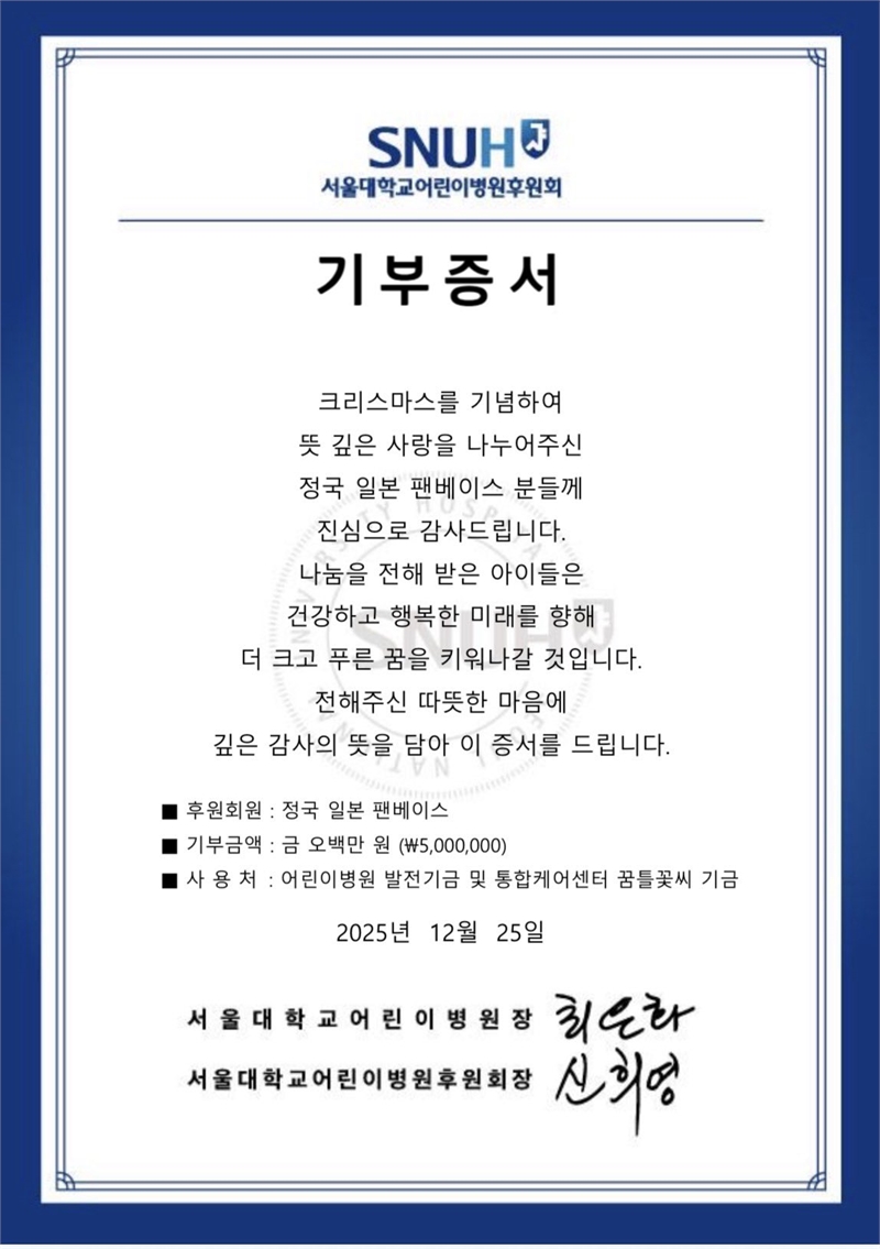 정국의 일본 팬클럽 '정국 재팬'은 '2025 산타 클로스 프로젝트'로 서울대어린이병원에 500만 원을 기부했다. 세이브더칠드런 재팬에도 50만엔(한화 약 475만 원)을 기부, 도합 한화 약 1000만 원의 기부금을 전달하며 선한 영향력을 전파했다.