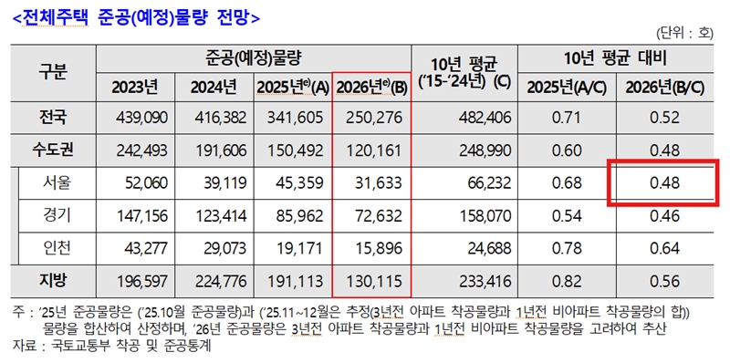 29일 주택산업연구원(주산연)의 '2026년 주택시장 전망' 보고서에 따르면 수급 불균형의 실태에 대해 이처럼 경고했다. 보고서가 제시한 데이터 중 서울의 공급 체력이 없다는 것이다. 2026년 서울의 주택(아파트+비아파트) 준공 물량 지수는 0.48로 추산됐다.