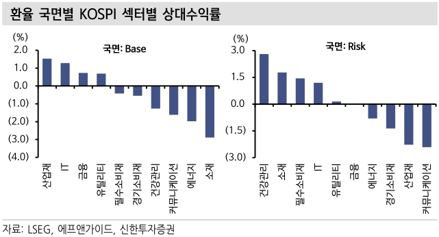 노 애널리스트는 섹터 성과가 환율의 방향성보다 외환시장 환경의 안정성에 민감하다는 점이 핵심이라고 짚었다. 그는 "베이스에선 산업재·IT 중심의 공격적 섹터 전략이 유효했으나, 리스크로 전환될 경우 해당 섹터의 비중을 축소하고 방어적 접근이 필요했다"며 "향후 전략은 환율 레벨 자체보다 변동성, 조달 스트레스 및 이에 반응하는 외국인 수급과 EPS 리비전의 방향을 기준으로 판단해야 한다"고 설명했다.