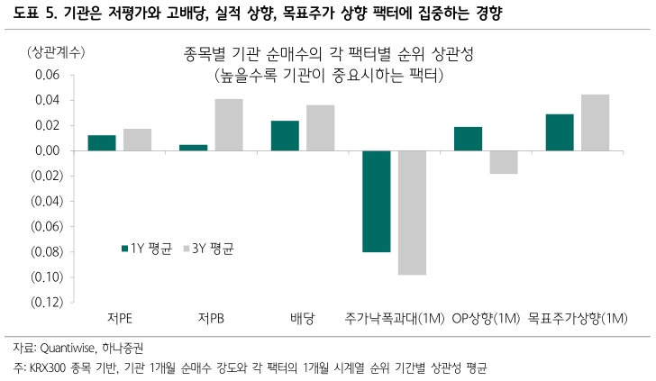 내년 시장에 대해선 기관 투자자 중심 장세가 펼쳐질 것으로 전망했다. 이 애널리스트는 "기관 투자자들의 자금 집행 가이드라인은 본질적으로 실적 가시성과 가격 정당성에 기반한다"며 "일반적으로 기관들은 연초 외에도 포트폴리오 구축 시 변동성이 높은 고성장주보다 밸류에이션 하단이 지지되는 가치주 팩터에 높은 가중치를 두는 경향이 있었다"고 풀이했다. 이는 저평가 및 고배당, 실적 상향, 목표주가 상향 팩터에 집중하는 경향을 보였다는 의미다.