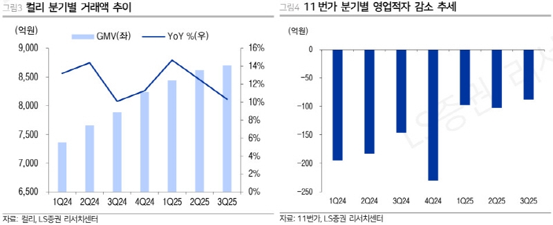 타 업체들의 공세가 가속화되고 있다는 점도 강조됐다. 오 애널리스트는 "네이버 플러스 스토어는 컬리와 제휴로 장보기 이용자를 선제적으로 확보해 신규 설치 순위 1위를 기록했다"며 "11번가는 슈팅배송 고객 수가 전년동기대비 229% 증가했고, 가공식품·신선식품 등 장보기 핵심 카테고리 전반에서 두 자릿수 이상의 고른 성장세를 기록했다"고 했다.
