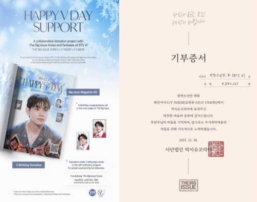 뷔의 글로벌 팬베이스 ‘V Union’과 한국 팬베이스 ‘V INSIDE’는 비영리 단체인 빅이슈 코리아의 노숙자 문제를 지원하는 기부 캠페인에 3년 연속 참여했다. 뷔유니언과 영국 팬베이스 ‘KTH_UK’는 “태형의 생일을 기념하고 뷔의 따뜻한 마음에 감동받아, 생명을 구하는 연구를 지원하기 위해 영국 암 연구 재단에 기부금을 전달했다”고 밝혔다.