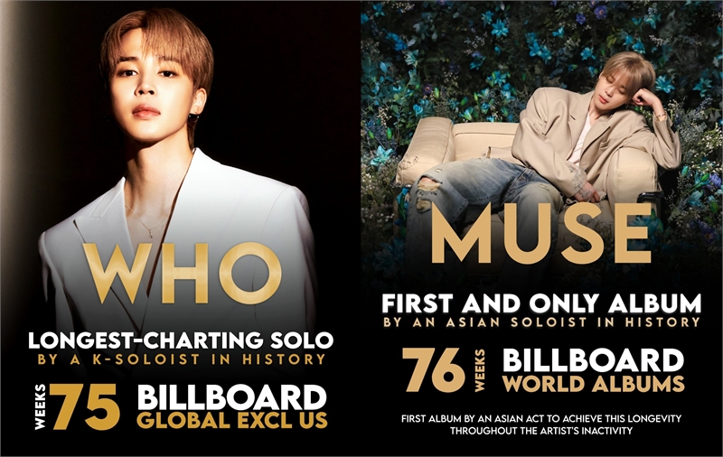 한편 빌보드 '월드 앨범' 차트에서 K팝 솔로 앨범 최초, 유일 8번의 1위를 기록한 지민의 'MUSE'(뮤즈)는 이번 주 18위로 76주 연속 차트인으로 해당 차트에서 76주를 보낸 K팝 솔로앨범 최초, 유일의 대기록을 세웠다. 이는 아시아 솔로가수의 앨범 중에서도 최초이자 유일한 기록으로 글로벌 인기를 증명하고 있다.