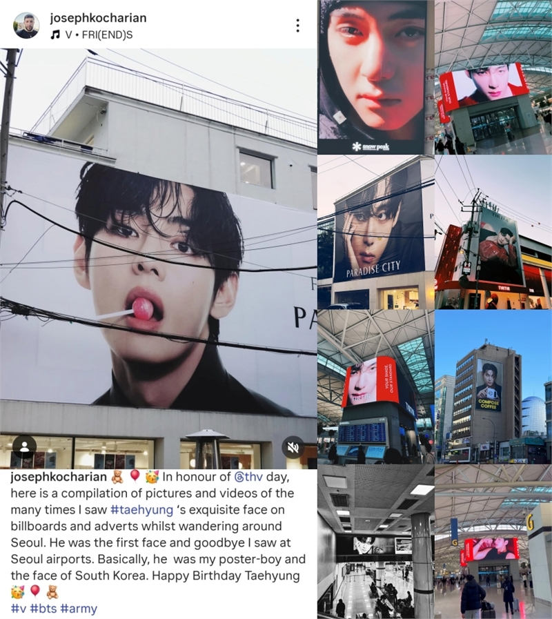조셉이 게재한 사진은 뷔가 앰버서더로 캠페인을 하고 있는 티르티르, 파라다이스시티, 스노우피크, 컴포즈커피 등이다. 조셉이 다녀간 서울에서는 그의 말대로 뷔의 모습을 어디에서나 발견할 수 있었다. 뷔가 캠페인을 하는 브랜드 광고는 물론 그의 생일을 축하하는 영상과 광고판이 공항, 호텔, 대형 빌딩, 지하철, 셀터, 도심 주요 도로부터 공원, 한강 등 서울의 랜드마크까지 장식했다.