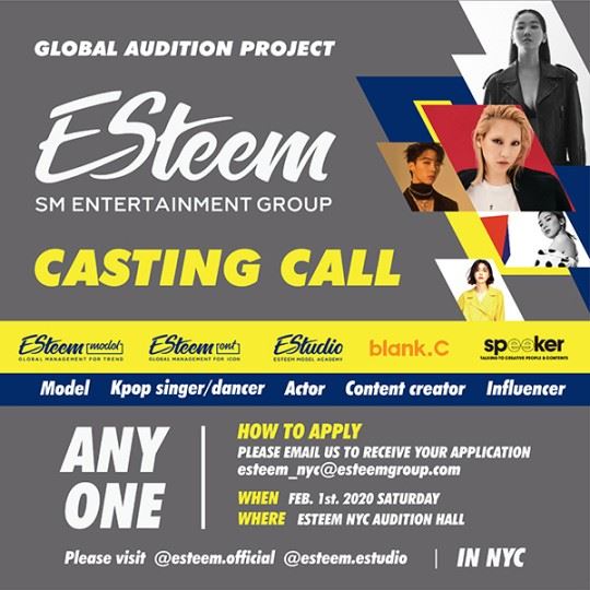 오디션은 2월 1일(현지 시간) 오전 11시부터 6시까지 에스팀 뉴욕 지사 이벤트 홀에서 진행되며, 에스팀 공식 SNS계정 및 이메일을 통해 지원할 수 있다. 자세한 정보는 에스팀 공식 SNS을 통해 확인 가능하다.