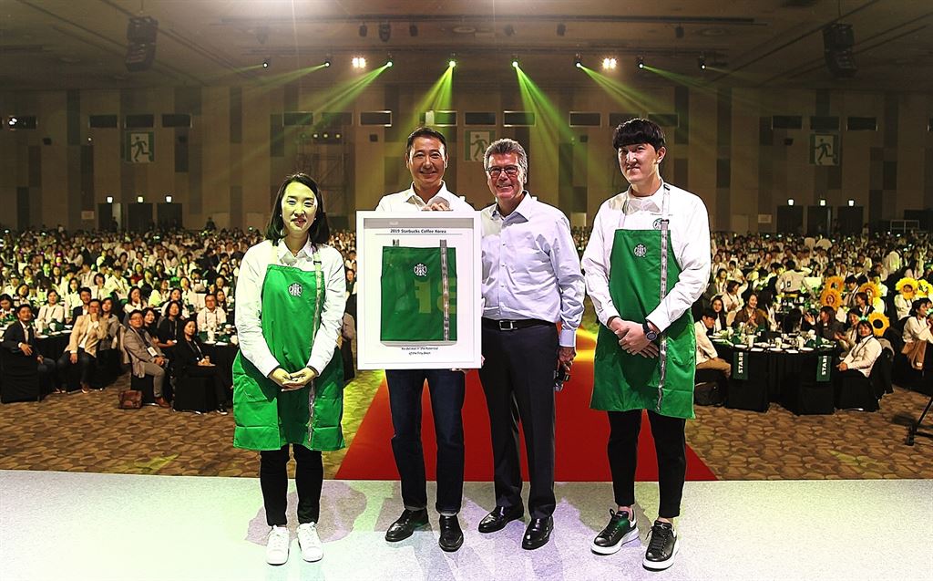 2019년 10월 개최한 스타벅스 코리아 리더십 컨퍼런스에서 존 컬버 스타벅스 글로벌 총괄 사장(오른쪽 2번째)이 송호섭 스타벅스커피 코리아 대표이사(오른쪽3번째)에게 커뮤니티 스토어를 상징하는 녹색 앞치마를 전달하고 있다. (사진=스타벅스코리아)