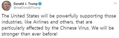 트럼프 대통령은 자신의 트위터에 "미국은 '중국 바이러스'(Chinese Virus)에 여파가 닿은 항공산업과 그 이외 산업에 강력하게 지원할 것"이라는 글을 남겼다. 해당 트윗의 중국 바이러스 표현이 문제가 된 것이다.