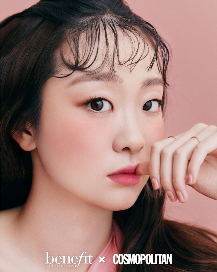 또 다른 화보에서는 핑크 블라우스와 귀여운 컬링 헤어를 김다미 특유의 개성으로 소화해내며 스타일리시한 매력을 선보였다. 베네피트 신제품 로즈 피치 블러셔 ‘슈가밤 미니’를 양 볼에 발라 사랑스러우면서도 로맨틱한 청순미를 드러냈다는 평이다. 또한 맑고 깨끗한 피부와 잘 어울리는 형광 체리 빛 ‘고고틴트’로 입술에 포인트를 더하고 ‘프리사이슬리 마이 브로우 펜슬’로 결을 살린 자연스러운 눈썹을 연출했다고 관련 전문가는 설명했다.