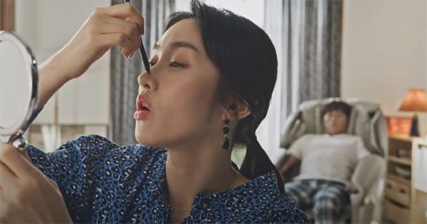 거울로 빨려 들어갈 듯 집중하는 아내, 코 위에 점을 하나 찍고 “요고~요고~ 누구 닮았지?”라고 묻는다. 안마기 위에 올라 앉아 휴식을 취하던 남편은 급 정색을 하더니 “장인어른?”이라고 되묻는다.