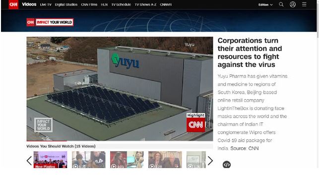 미국의 24시간 뉴스 전문채널 CNN은 코로나 바이러스에 맞서는 전 세계의 다양한 모습들을 연속 보도하고 있다. 유유제약은 중국의 온라인쇼핑몰, 인도의 IT기업과 함께 코로나 바이러스 사회공헌활동을 펼친 아시아 기업 중 하나로 소개됐다.