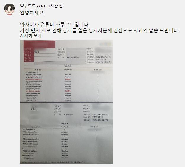 강제 성관계 및 성병을 고의로 옮겼다는 의혹을 받고 있는 유튜버 약쿠르트가 사과문을 게재했다.