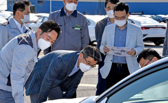 국내공장 수출을 확대하기 위해 송호성 사장이 20일 평택항에서 수출을 독려하고 차량 품질을 점검했다. (사진=기아자동차)