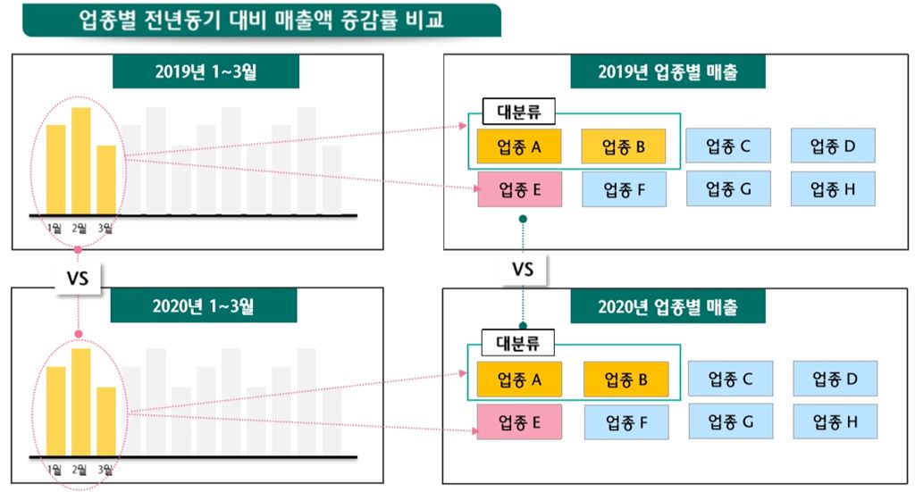 보고서의 업종별 실적 분석에 따르면 코로나19 여파로 인해 여행사, 영화관, 테마파크의 매출 피해가 가장 심각했으며, 학원, 유흥, 음식점 업종의 매출 감소도 큰 것으로 나타났다. 반면 인터넷 쇼핑 매출이 큰 폭으로 증가하고 수입차, 성형외과, 자전거 판매점의 매출은 늘어 대조를 이루었다. 대형마트 대신 비교적 근거리에 있는 수퍼마켓, 정육점, 농산물매장에서 식재료를 구매해 집에서 조리해 먹는 “홈쿡” 현상이 확산되는 등 코로나19가 가져온 소비 행태 변화가 다양하게 나타난 것으로 분석되었다.
