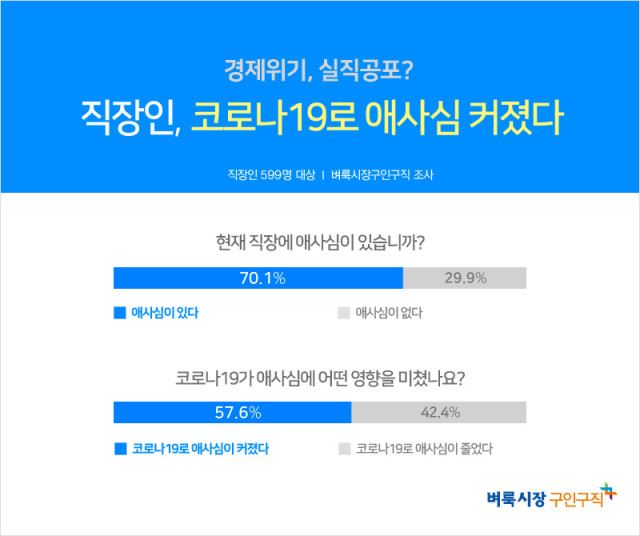 직장인 10명 중 7명은 현재 직장에 애사심이 있는 것으로 나타났다. 또한 경기침체와 코로나19가 장기화되면서 직장인들의 애사심이 높아진 것으로 조사됐다.