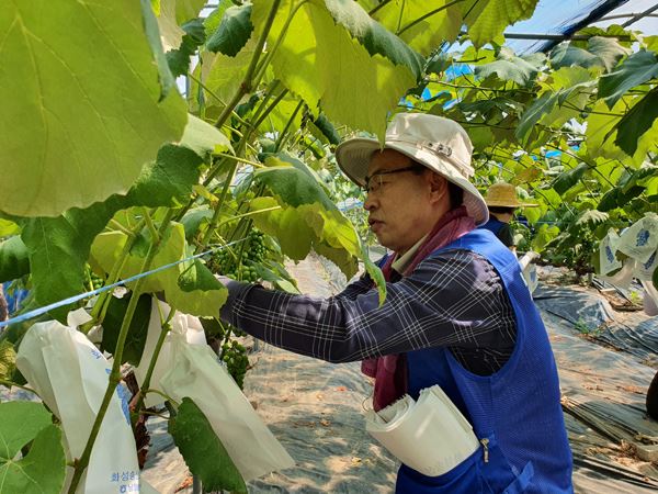 리스크관리부문 송수일 부행장이 포도농가를 방문해 일손돕기를 실시하고 있다. (사진=NH농협은행)