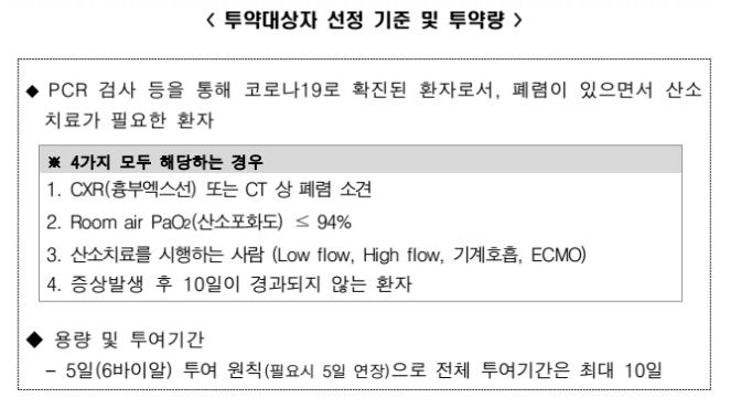 투약자 세부조건은 세부 조건은 ▲CXR(흉부엑스선) 또는 CT상 폐렴 소견 ▲산소포화도 94% 이하 ▲산소치료를 시행하는 사람(기계호흡, 에크모 등) ▲증상 발생 후 10일이 지나지 않는 환자 등 네 가지를 모두 충족해야 한다.