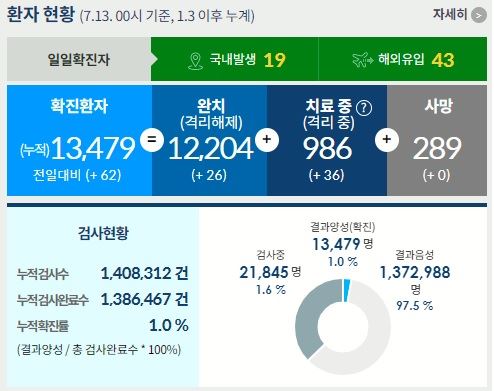 중앙방역대책본부는 13일 새벽 0시 기준 신규 확진자가 전날보다 62명 늘어 누적 확진자는 총 1만3479명이라고 밝혔다. 사망자는 발생하지 않아 전날과 같은 289명을 유지했다.