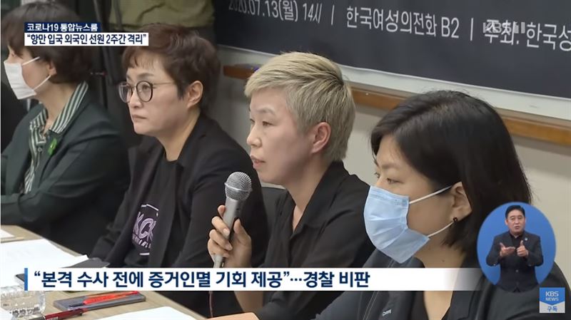 13일 고(故) 박원순 시장의 전 여비서 A씨 측 법률대리인 김재련 변호사(왼쪽 세번째)가 서울 은평구 한국여성의전화 사무실에서 기자회견을 갖고 A씨의 성추행 고소 이유 등에 대해 설명하고 있다. (자료=KBS)