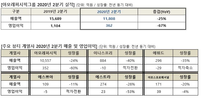 아모레퍼시픽그룹 2020년 2분기 실적(자료=아모레퍼시픽)